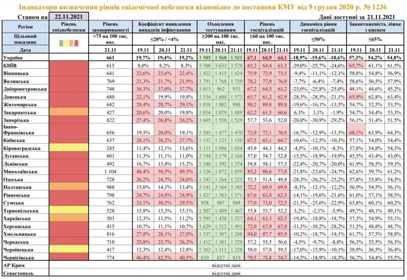 Зокрема, знижується рівень госпіталізації з 52,5% станом на 19 листопада до 49,8% станом на 21 листопада. Також завантаження ліжок стабільно нижча за 65%.