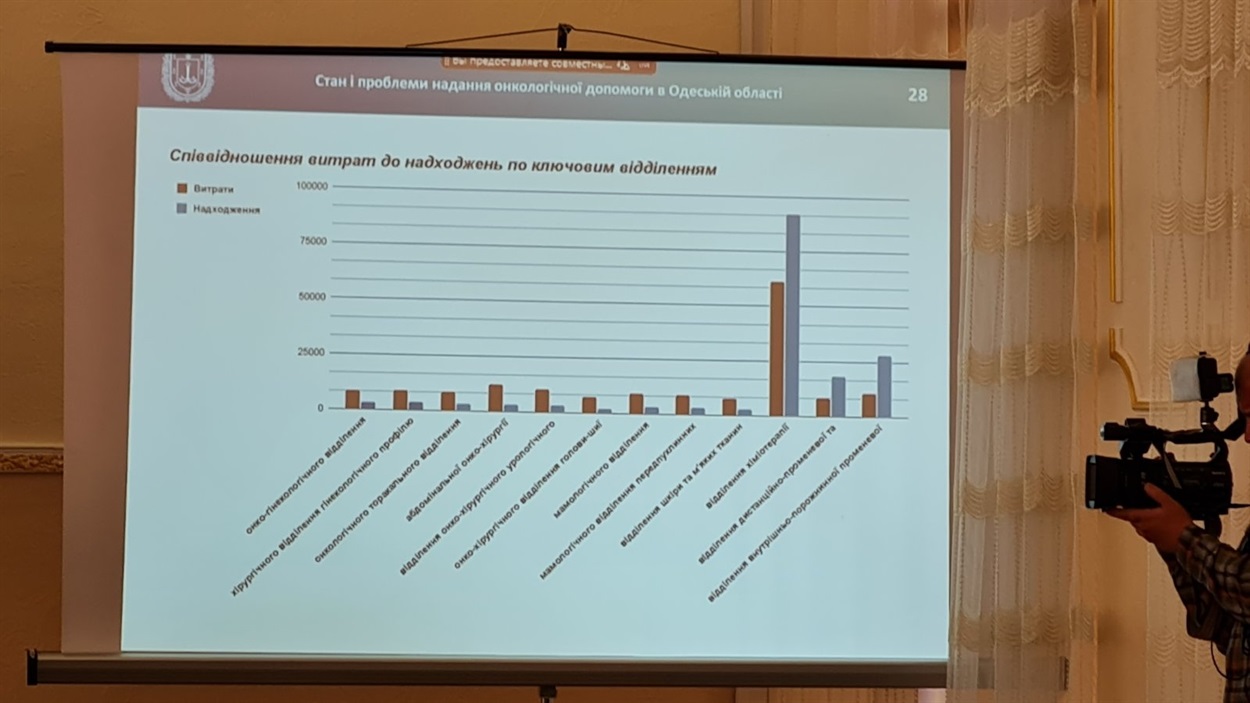Навіть в Одеському онкологічному диспансері лише 3 відділення з 12 мають більше доходів від НСЗУ, ніж несуть видатків на утримання персоналу та поточних витрат. Фото - з презентації директора Одеського онкологічного диспансеру В’ячеслава Полясного, Арциз, жовтень, 2021