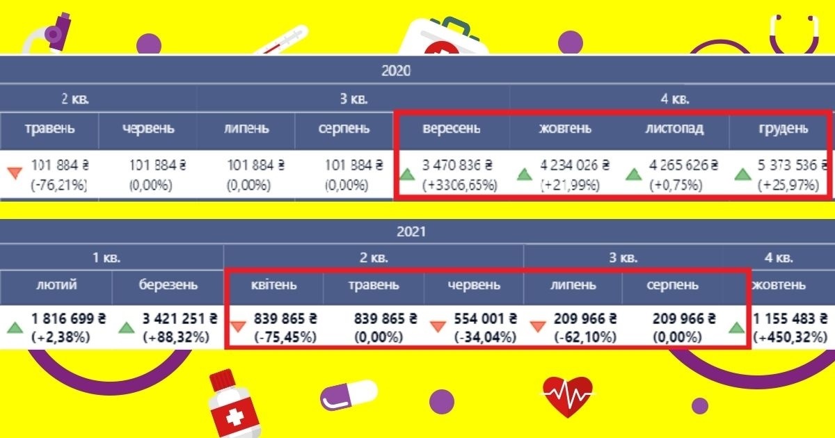 Порівняльна таблиця прибутків закладу у 2020 та 2021 роках. Дані дашбордів НЗСУ України
