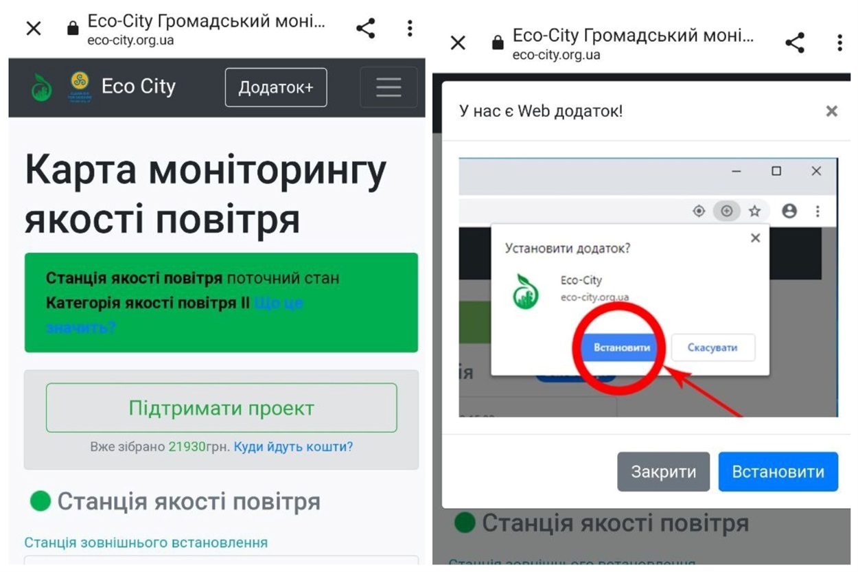 Зайдіть на сайт через гугл пошук, ввівши EcoCity, або за посиланням (https://eco-city.org.ua/). Сайт може запросити дані вашого місцезнаходження, щоб знайти станцію. Зверху клацніть на «Додаток+», коли відкриється нове вікно, клацніть на «Встановити».