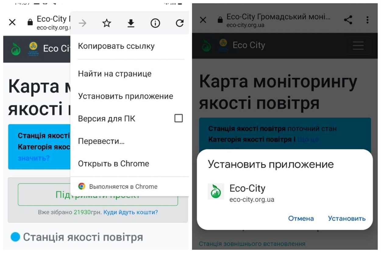 Або у самому верху натисніть на три крапки, потім - на встановити додаток на головний екран. У вашому телефоні з’явиться значок мобільного додатку EcoCity. Заходьте і дізнаватесь там усю інформацію про якість повітря.