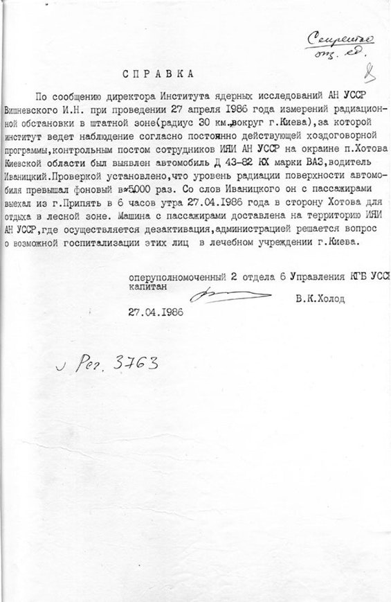 У цей час в розсекречених архівах знаходяться документи про виявлення автомобіля Д 43-82 КХ марки ВАЗ, рівень радіації на поверхні якого перевищує фоновий у 5000 разів.