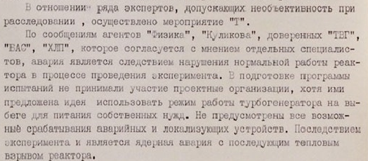 Через шість днів після аварії з'являються версії, що спричинило аварію. Так, підполковник Аксьонов вважає, що причина - порушення нормальної роботи реактора стала наслідком порушення нормальної роботи реактора під час експеременту, який не був узгоджений з фахівцями.