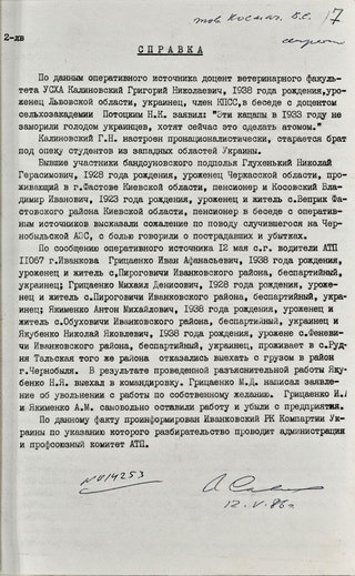 "Эти кацапы в 1933 году не заморили голодом украинцев, хотят сейчас это сделать атомом".Громадянин Антон Якименко, житель с.Обуховичі відмовився їхати у відрядження в район міста Чорнобиль. З чоловіком провели бесіду і він поїхав.
