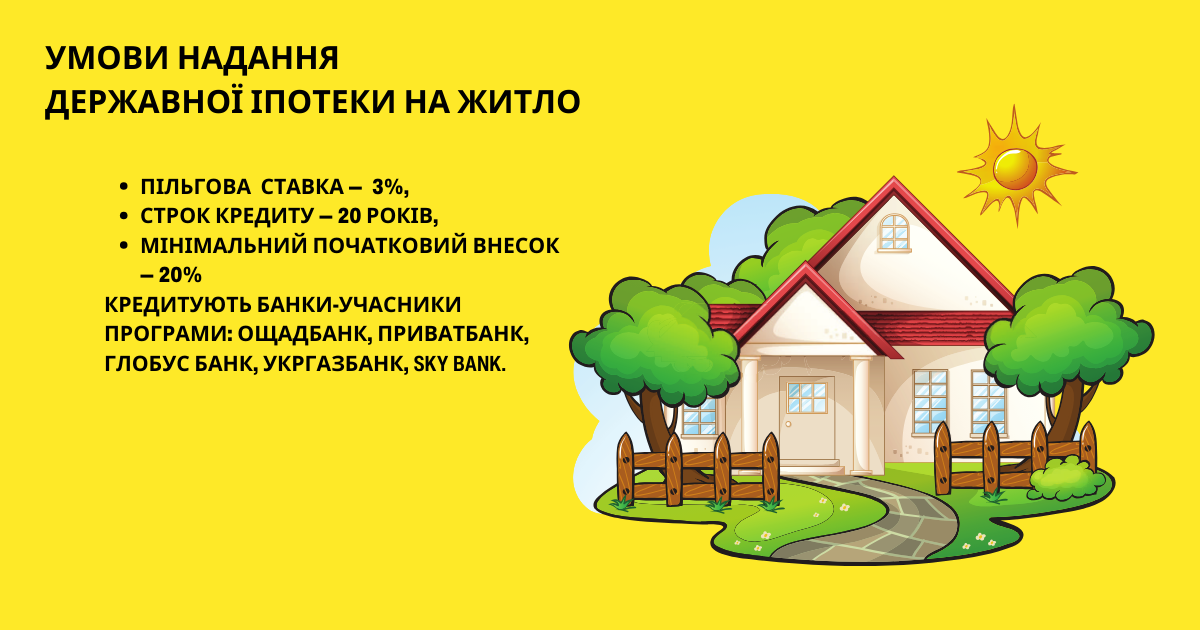 Умови надання державної іпотеки на житло для вищенаведених категорій громадян: пільгова ставка — 3%, строк кредиту — 20 років, мінімальний початковий внесок — 20%, кредитують банки-учасники програми: Ощадбанк, ПриватБанк, Глобус Банк, Укргазбанк, Sky Bank.