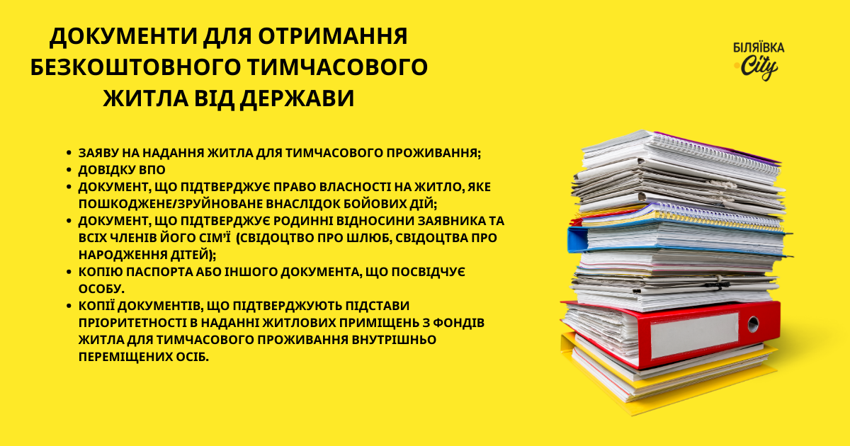 Для отримання безкоштовного тимчасового житла від держави потрібно подати такі документи: