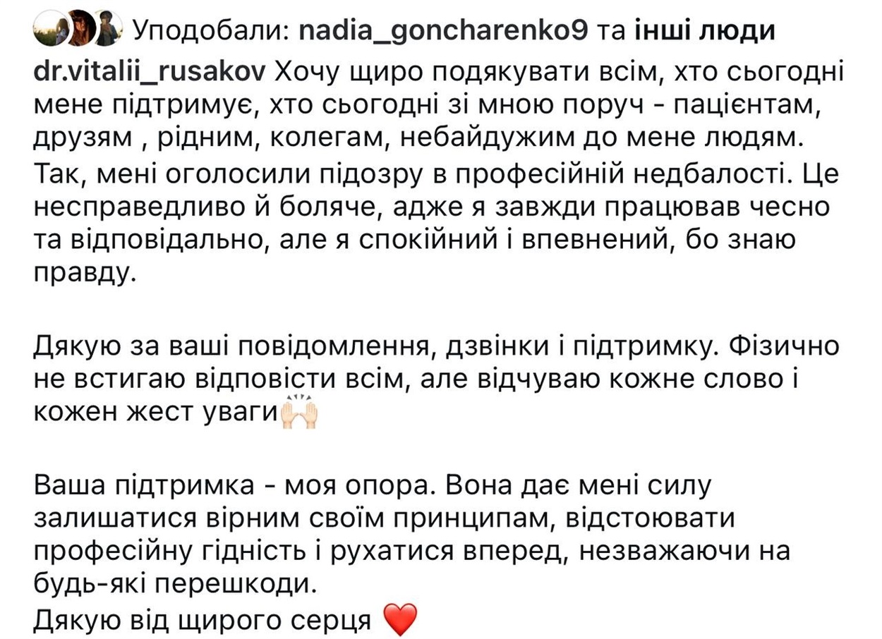 Водночас в коментарі під новиною сайту УСІ пацієнти пишуть подяки лікарю за високопрофесійність та врятоване життя, і пов'язують справу з впливом та статусом родини, яка не може змиритися зі смертю рідної людини.