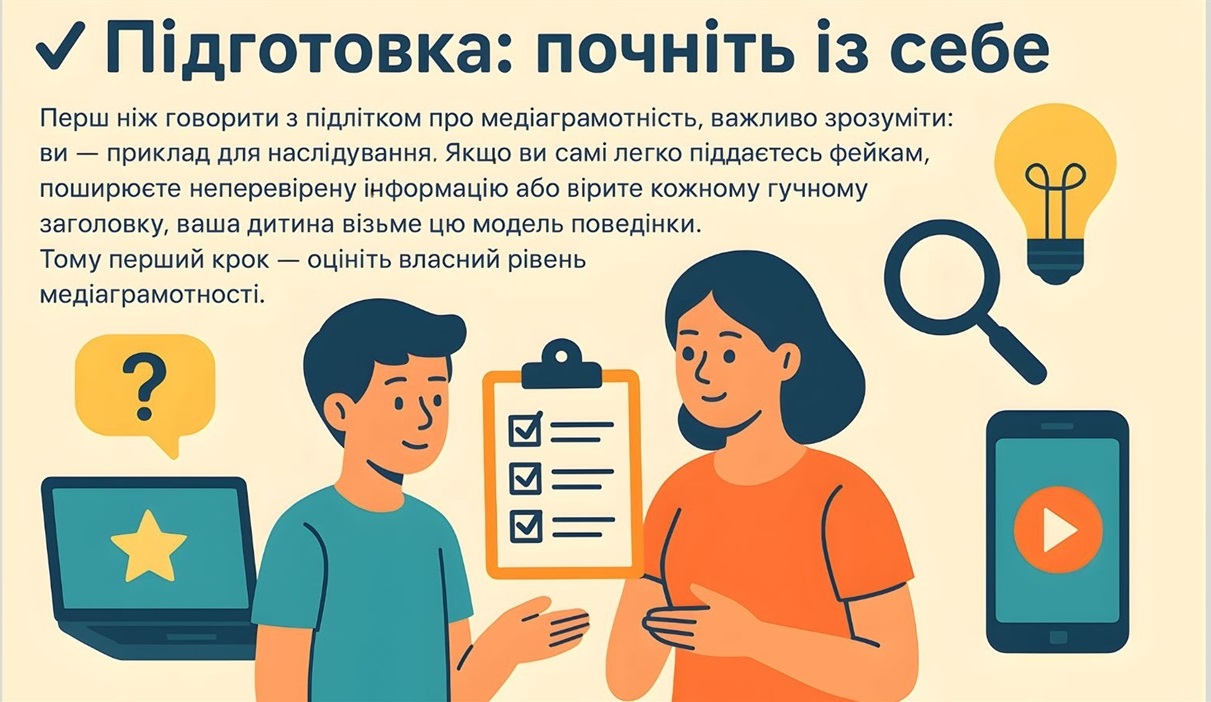 Перш ніж говорити з підлітком про медіаграмотність, важливо зрозуміти: чи ви — приклад для наслідування. Якщо ви самі легко піддаєтеся фейкам, поширюєте неперевірену інформацію або вірите кожному гучному заголовку, ваша дитина візьме цю модель поведінки. Тому перший крок — оцініть власний рівень медіаграмотності.