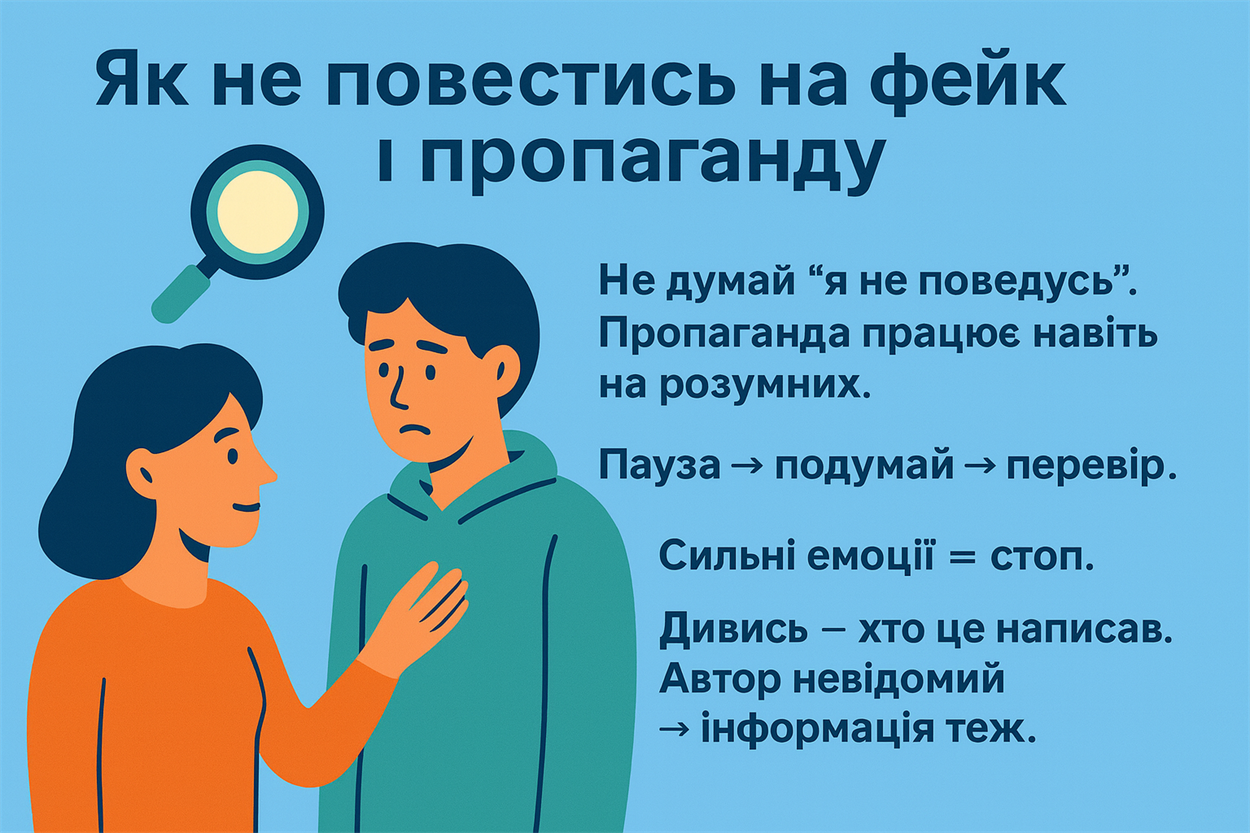 Поясність, що фейки, як пастки. Вони працюють лише тоді, коли ми віримо першому, що побачили. Якщо навчитися ставити кілька простих запитань — тебе ніхто не обдурить.