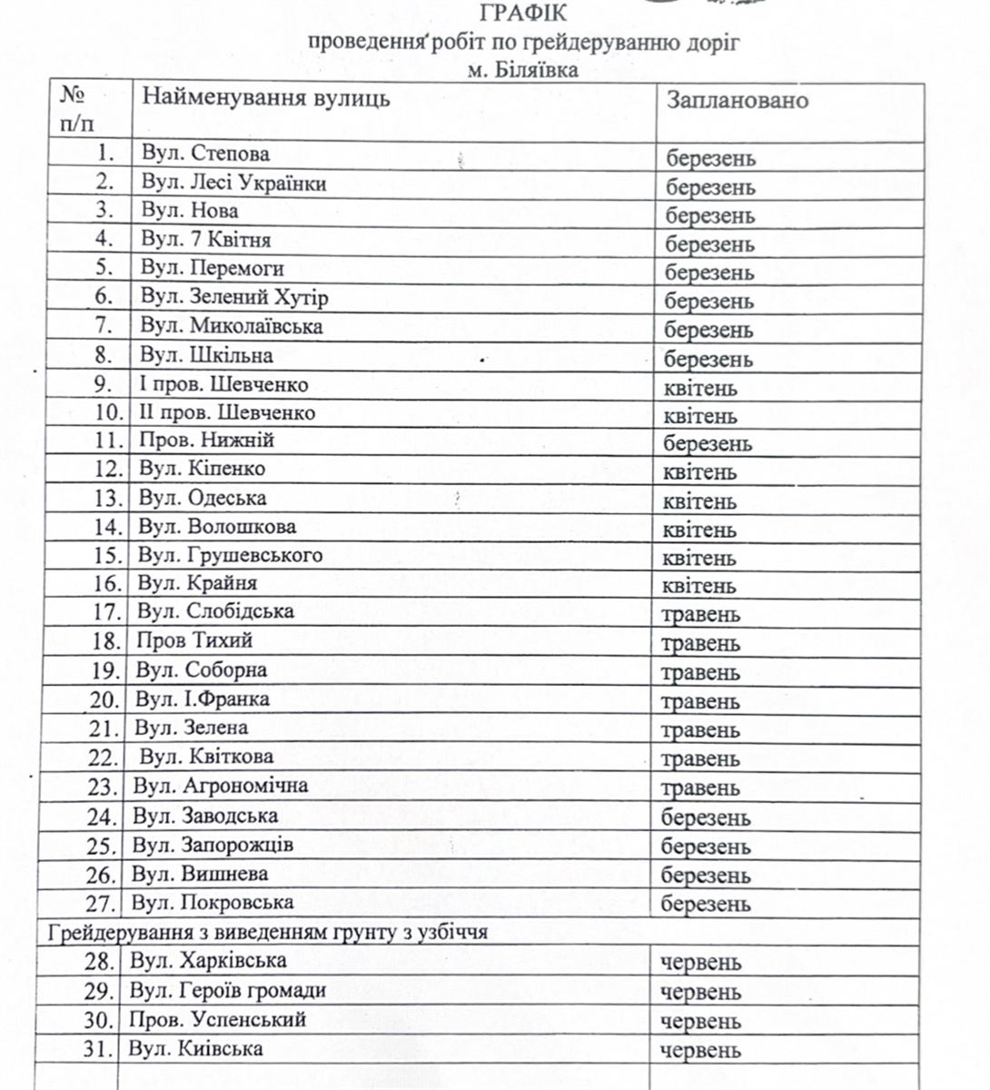 Наразі управління ЖКГ та старости доопрацьовують список вулиць, які потребують грейдерування. Пріоритет надаватимуть найбільш соціально значущим ділянкам, якими щодня користується найбільша кількість людей. Коли графік остаточно узгодять, ми його опублікуємо.