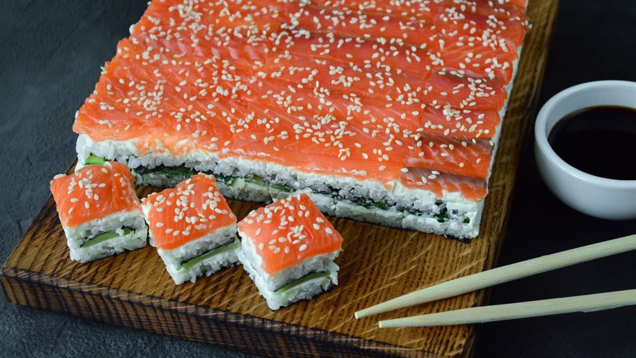 - Далі шарами викладаємо салат: рис – заправка – огірок – крем-сир – лосось – заправка – рис – заправка – авокадо+лосось, останній шар - або кунжут, або суцільно вкрити лососем. Можна за смаком додати один шар подріблених норі. Збирати краще квадратом, у прозору піалку чи склянку.