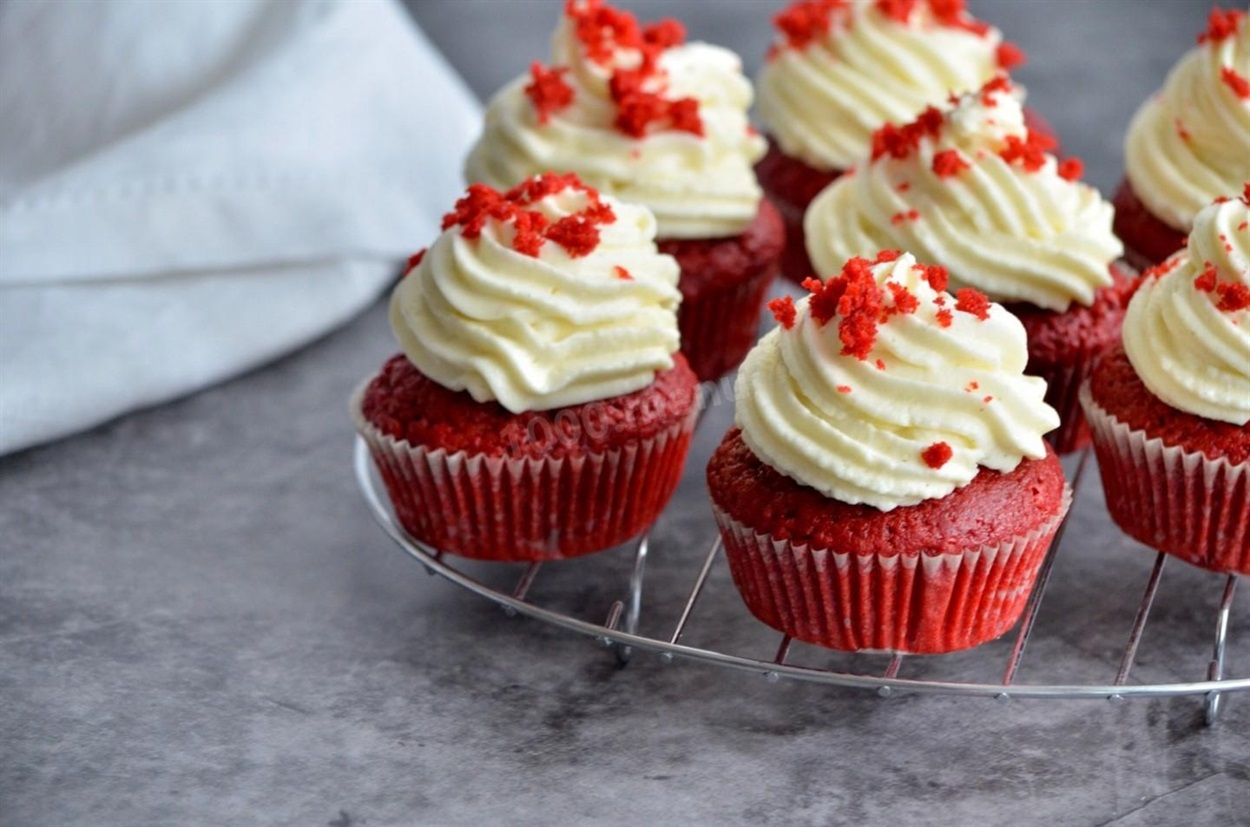 Червоні оксамитові мафіни з білого шоколаду з начинкою з вершкового сиру