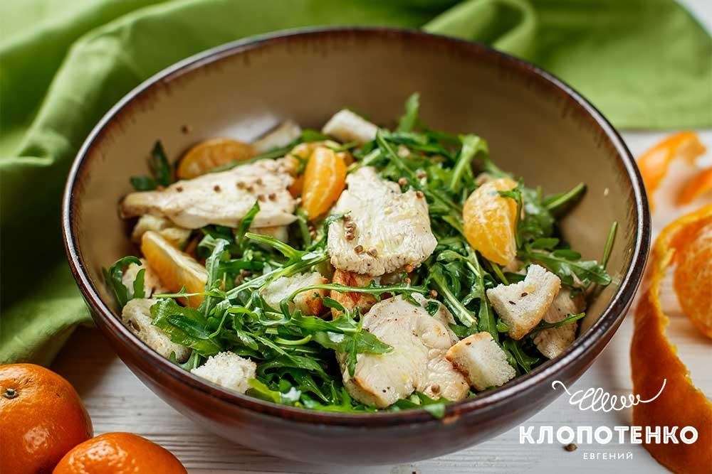 У салатник викладіть зелень руколи (100 г) і часточки мандарина (1 шт.) без кісточок. Батон (2 скибочки) наріжте невеликими кубиками і обсмажте 5-7 хвилин на сковороді з 1-2 ст. л. рослинної олії до золотистої скоринки. Половину курячої грудки наріжте якомога більш тонкими слайсами під кутом 45 градусів. Збризніть курку невеликою кількістю лимонного соку, посоліть і поперчіть за смаком. Розігрійте сковороду з 2 ст.л. рослинного масла і обсмажте куряче філе до готовності.