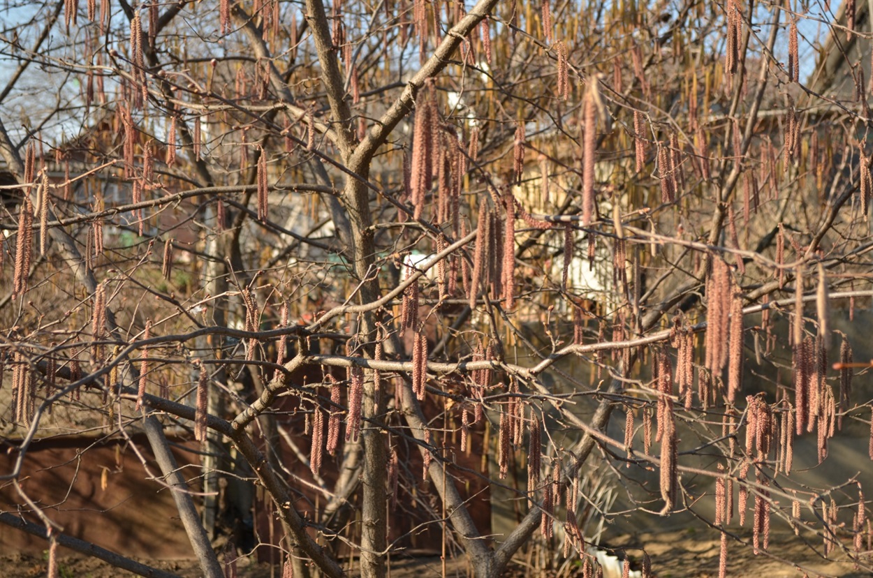 Ростуть в саду також декілька кущів фундука. Зараз він якраз цвіте.