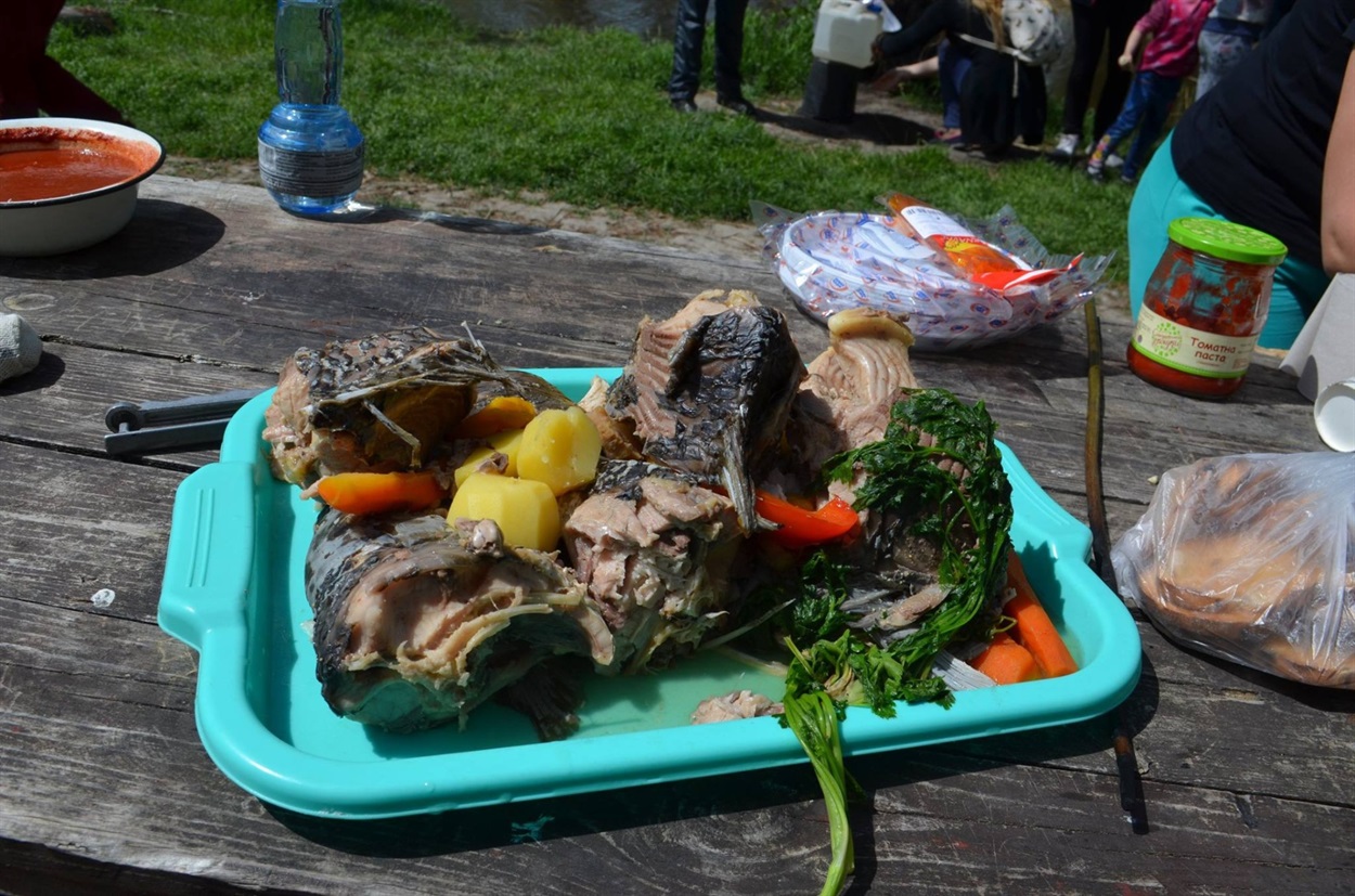 Всі компоненти він додає "на глаз", в залежності, хто і як любить - хтось гостріше, хтось м'якіше. Юшку він подає окремо у келихах, а на велике блюдо викладає варену рибу, зелень, овочі, саламур. І кожен вже для себе міксує той варіант, який смакуватиме найбільше.