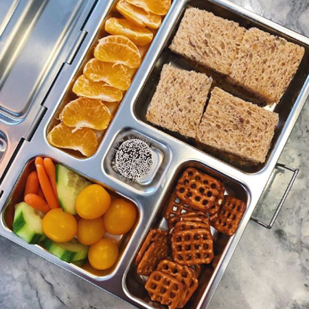 В цьому ланч-боксі - бутердроди. Бажано без магазинної ковбаси, а чимось домашнім: запеченим чи відвареним м'ясом, якісною шинкою, сиром тощо. Мікс овочів. Якщо нарізати різних та покласти кольоровими смужками - це виглядатиме дуже привабливо для того, щоб їх з'їли навіть ті, хто не дуже полюбляє овочі.