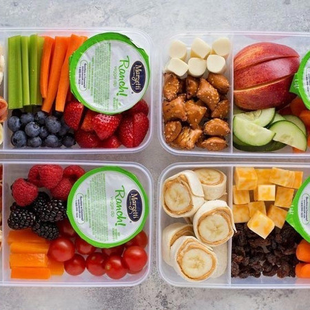 Варіант 15, уныверсальний. Несолодкий йогурт, мыкс овочів, фруктів, шинка, сир або бутерброд з маленькими шматочками ковбаси, яку все ж краще замінити на рибу.