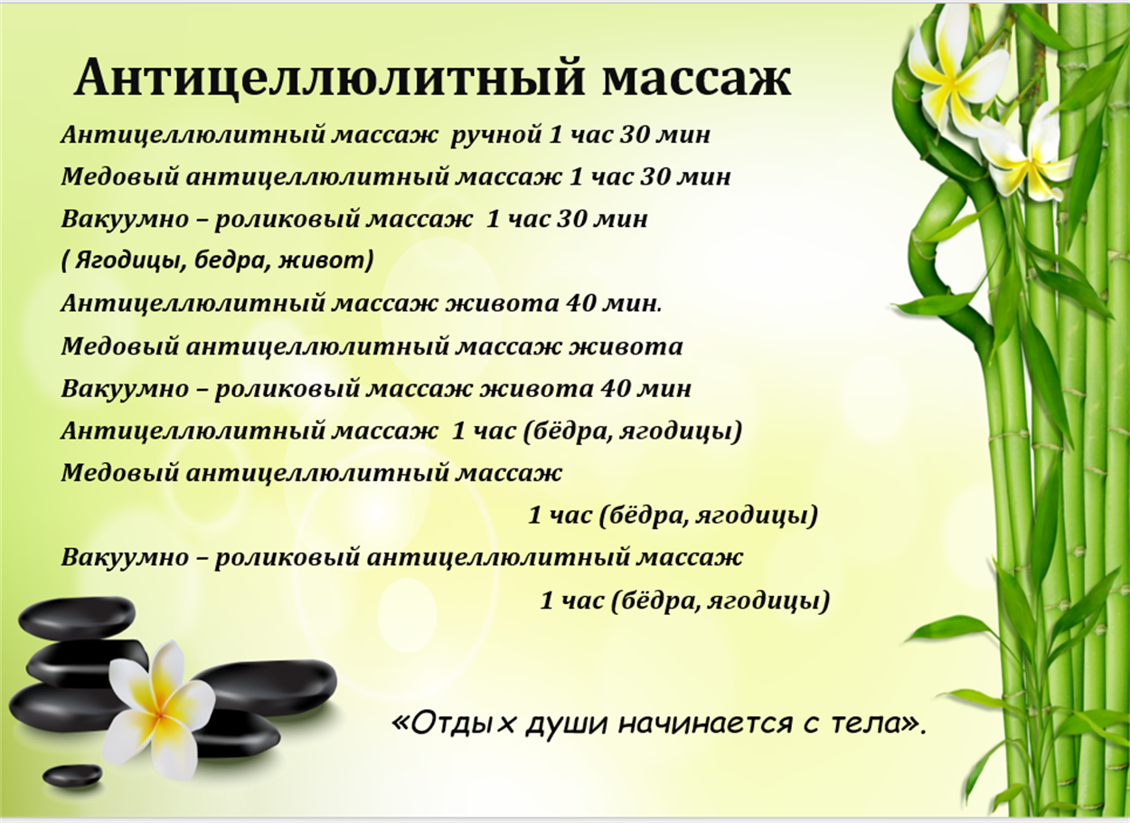 Антицеллюлитный массаж стимулирует процессы внутри организма, благодаря которым есть возможность вывести лишнюю воду и шлаки из жировых клеток и подкожно-жировой клетчатке и уменьшить или устранить полностью целлюлит.